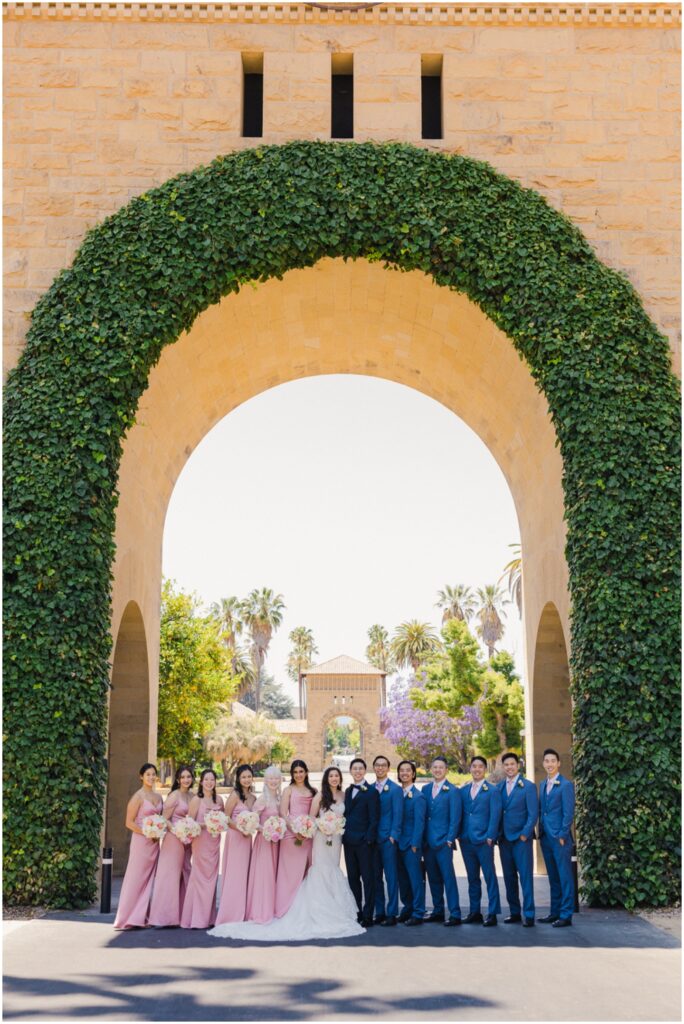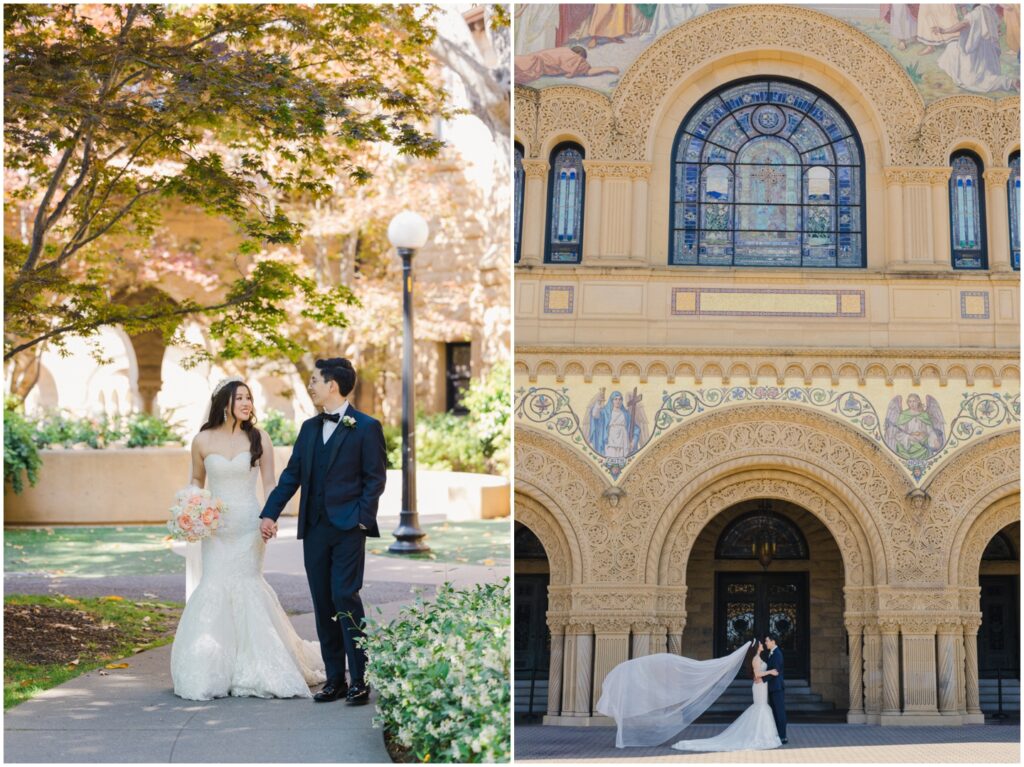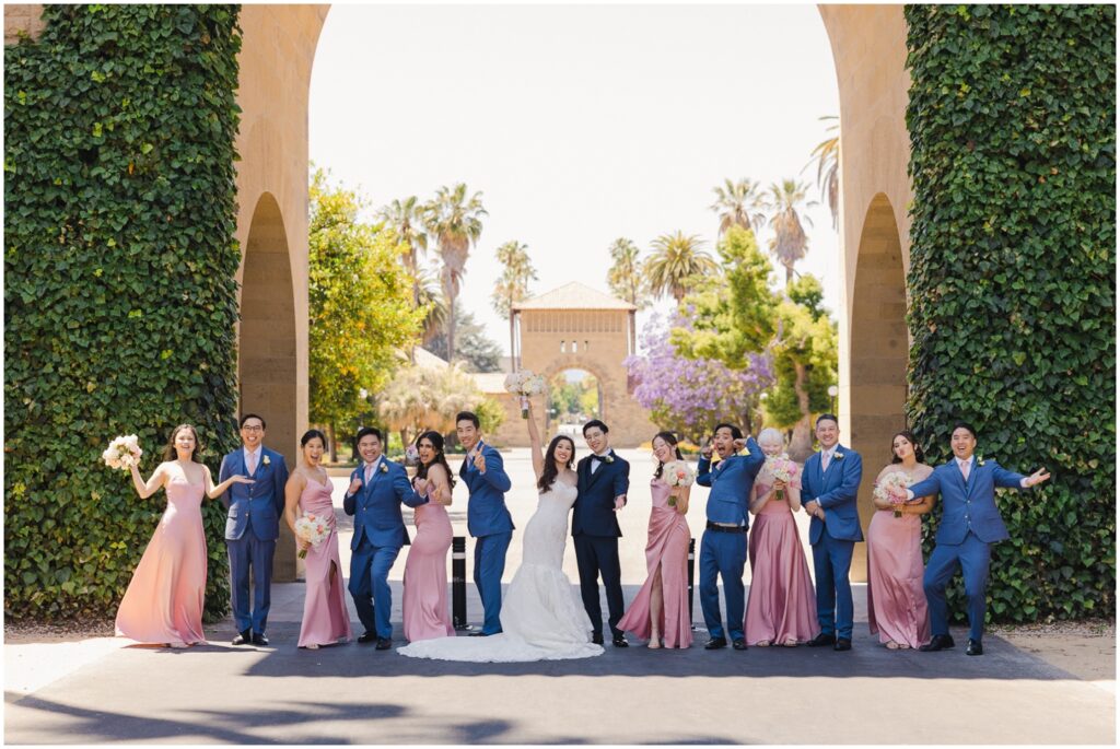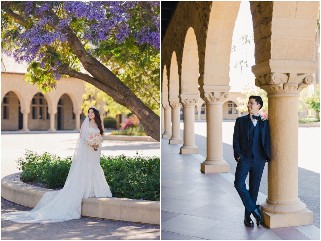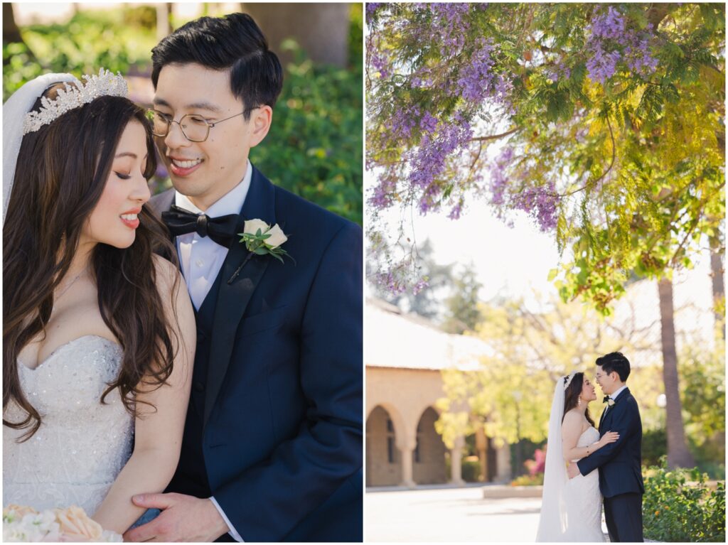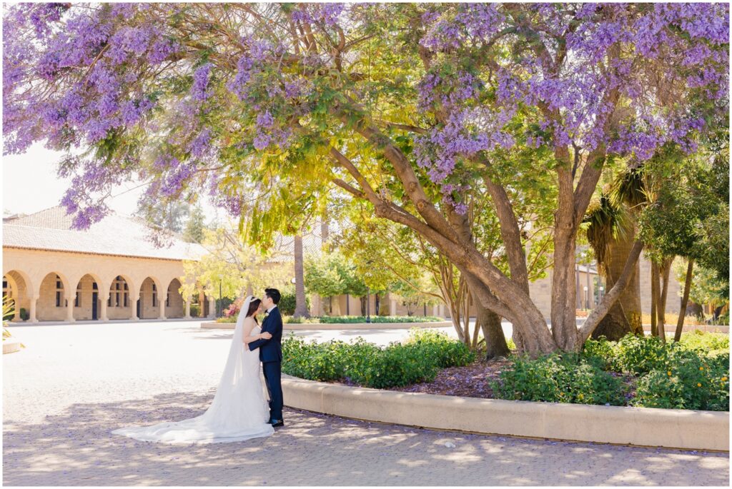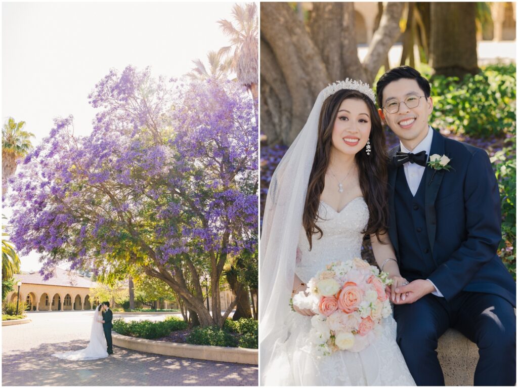 I’m thrilled to share a glimpse into M+J’s unforgettable wedding day—all set on the stunning Stanford University campus! Since M studied at Stanford, it was incredibly meaningful for her to tie the knot at a place so close to her heart. The couple chose The Stanford Faculty Club not only for their reception but also as their getting-ready and overnight spot, making the day seamless and stress-free for everyone. One special backdrop to photograph with was a gorgeous purple tree in bloom right in front of Stanford Memorial Church. Its vibrant colors made the perfect backdrop for portraits.