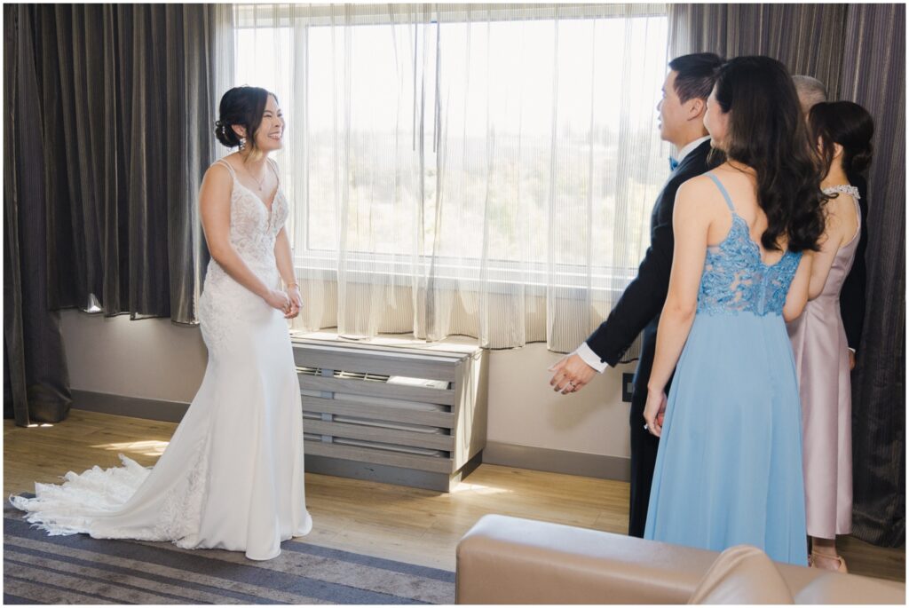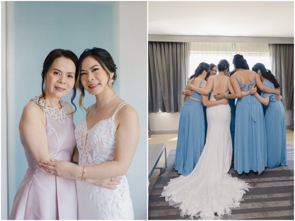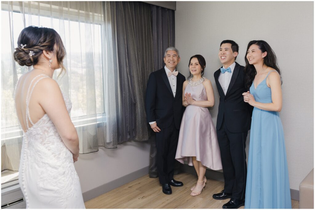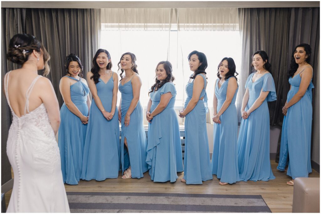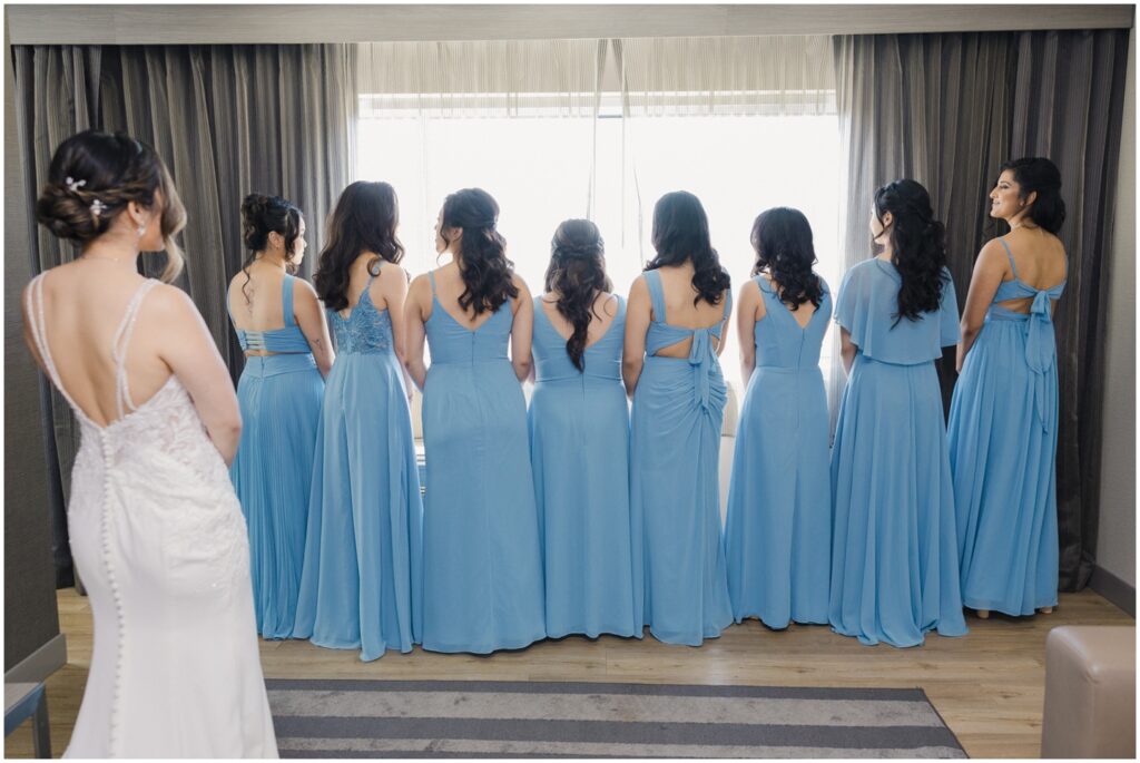 We began the day at a nearby hotel where both M and K got ready. M was surrounded by her 8 bridesmaids and her “man-of-honor” — her brother — making for such a fun and supportive atmosphere. Before heading to the venue, M chose to do two special first looks at the hotel: one with her bridesmaids and another with her immediate family. The reactions were priceless, and it was clear just how loved and radiant she was as a bride.