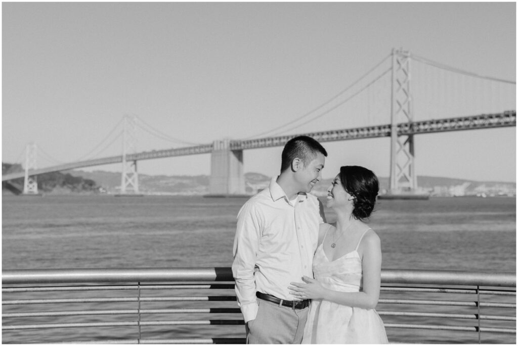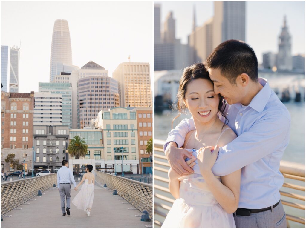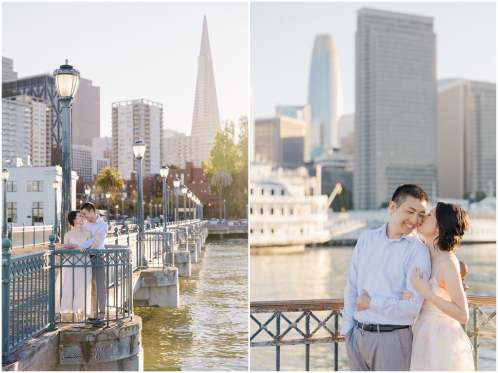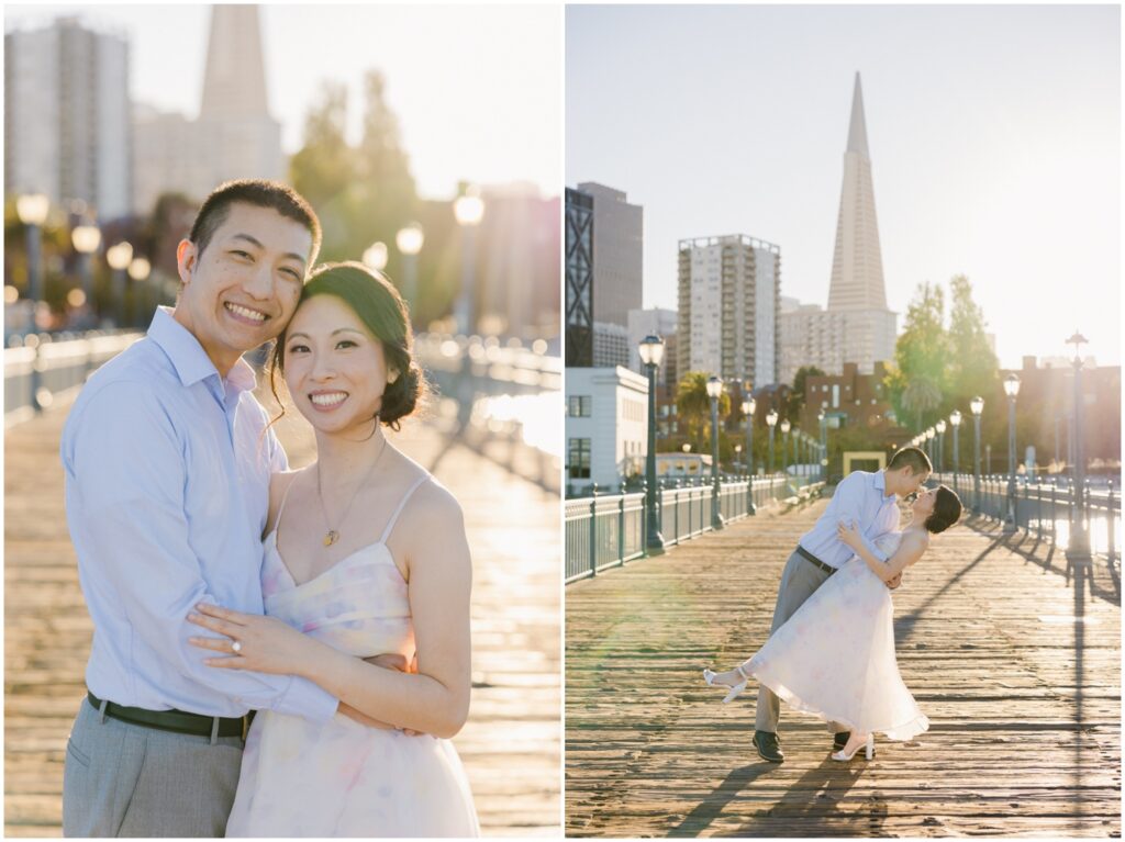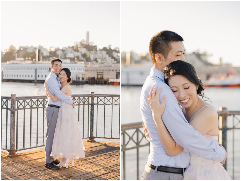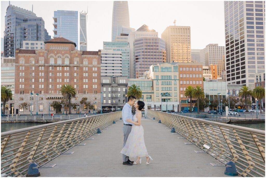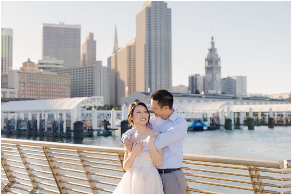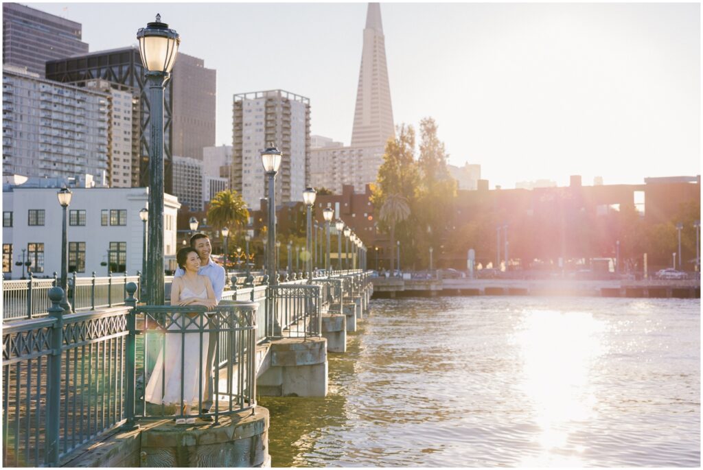 N + C are one of my wonderful 2026 wedding couples, and I had the pleasure of photographing their engagement session on a beautiful, sunny Fall day in San Francisco! The City is home for them, and what better way to celebrate their love than by capturing it against the backdrop of the iconic Embarcadero! We began our session at Pier 14, where the skyline offered the perfect mix of modern lines and sparkling water — a stunning view of the city they adore. From there, we made our way to the Ferry Building, soaking in the lively energy of city life, surrounded by locals, marketgoers, and the hum of Muni cars. We wrapped up the evening at Pier 7, one of my favorite spots in the city. The rustic dock, full of charm and character, was bathed in the most magical golden light — a photographer’s dream! A huge shoutout to my dear friend and talented colleague, Aimee, who did a flawless job glamming up our gorgeous bride-to-be. N + C’s love and laughter made this session such a joy, and I can’t wait to celebrate with them again at their City Hall wedding this Spring!