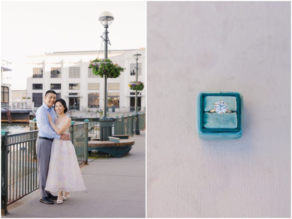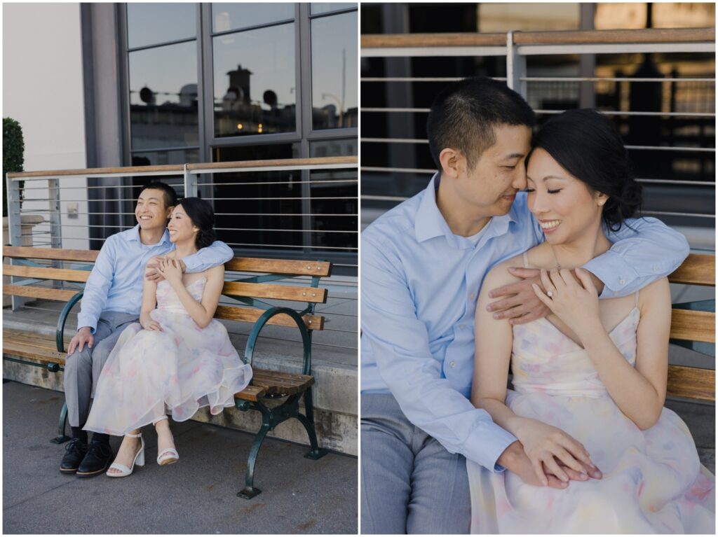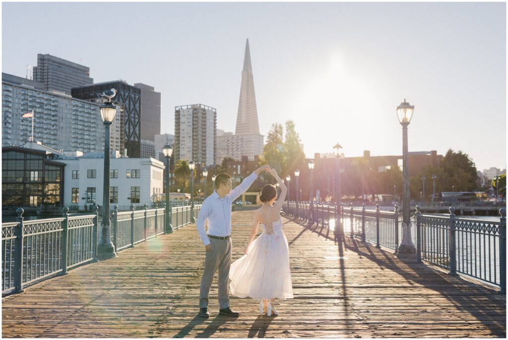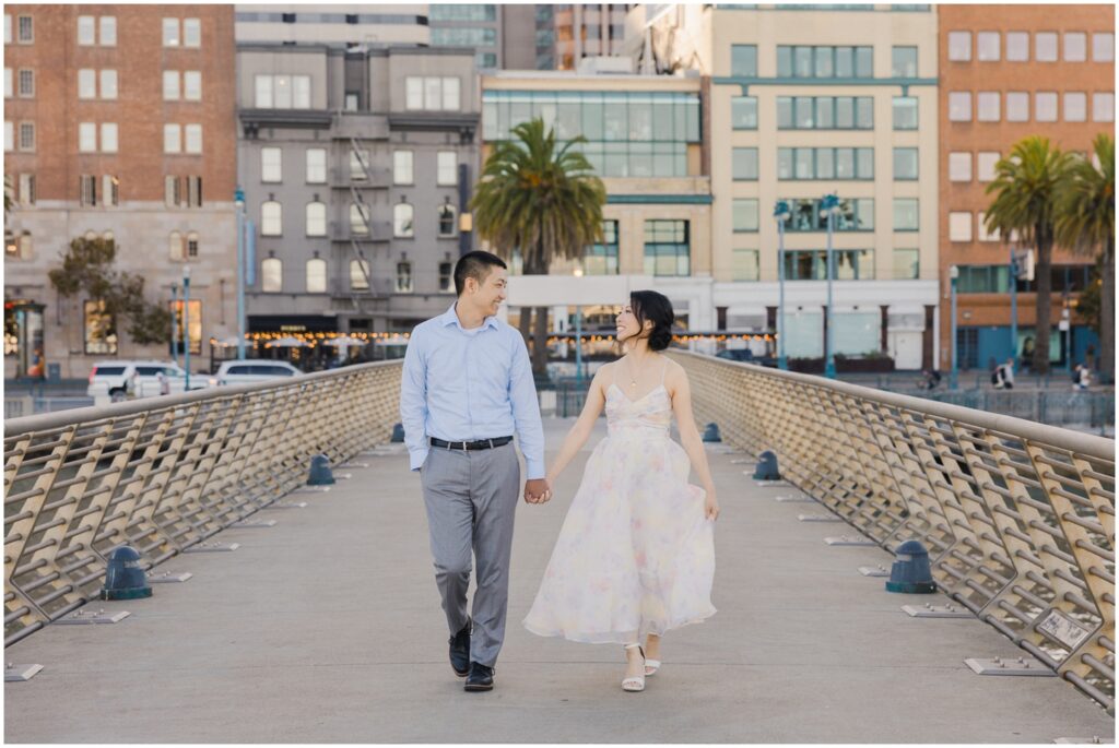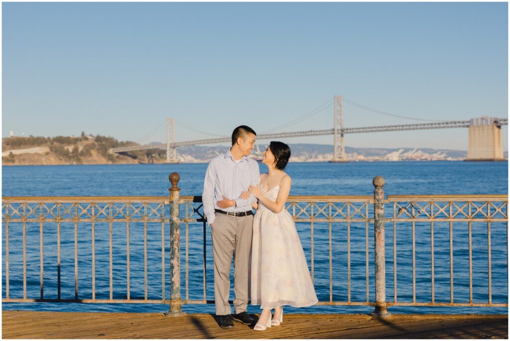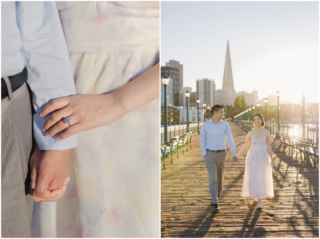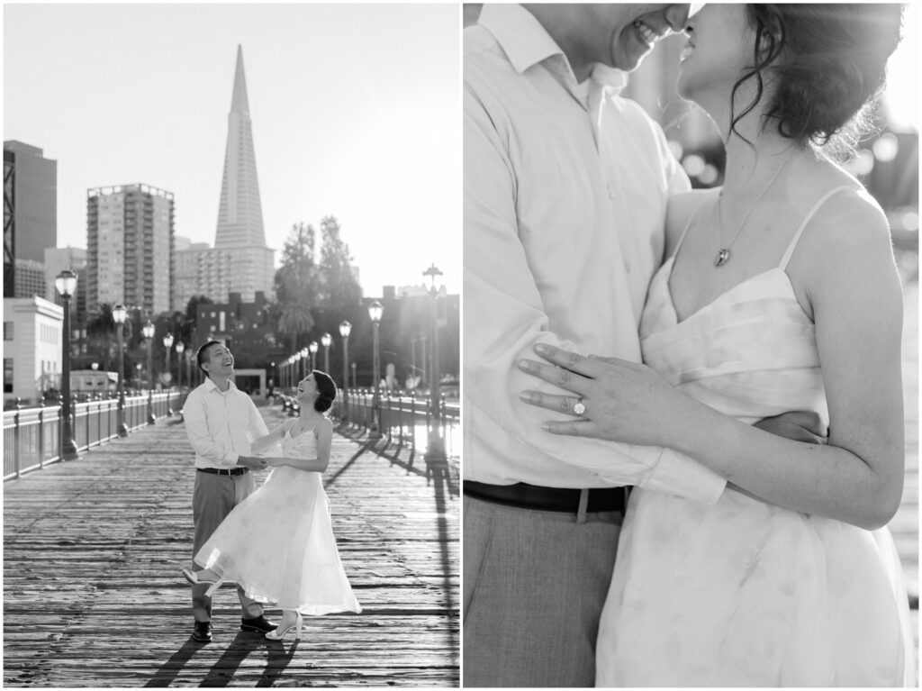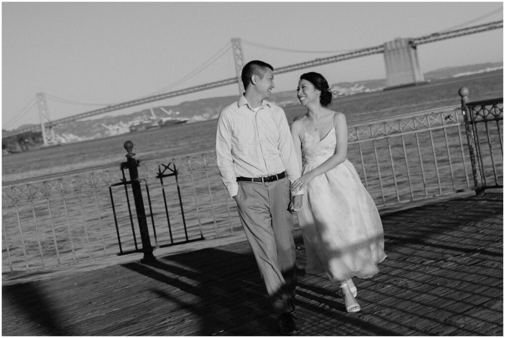 N + C are one of my wonderful 2026 wedding couples, and I had the pleasure of photographing their engagement session on a beautiful, sunny Fall day in San Francisco! The City is home for them, and what better way to celebrate their love than by capturing it against the backdrop of the iconic Embarcadero! We began our session at Pier 14, where the skyline offered the perfect mix of modern lines and sparkling water — a stunning view of the city they adore. From there, we made our way to the Ferry Building, soaking in the lively energy of city life, surrounded by locals, marketgoers, and the hum of Muni cars. We wrapped up the evening at Pier 7, one of my favorite spots in the city. The rustic dock, full of charm and character, was bathed in the most magical golden light — a photographer’s dream! A huge shoutout to my dear friend and talented colleague, Aimee, who did a flawless job glamming up our gorgeous bride-to-be. N + C’s love and laughter made this session such a joy, and I can’t wait to celebrate with them again at their City Hall wedding this Spring!
